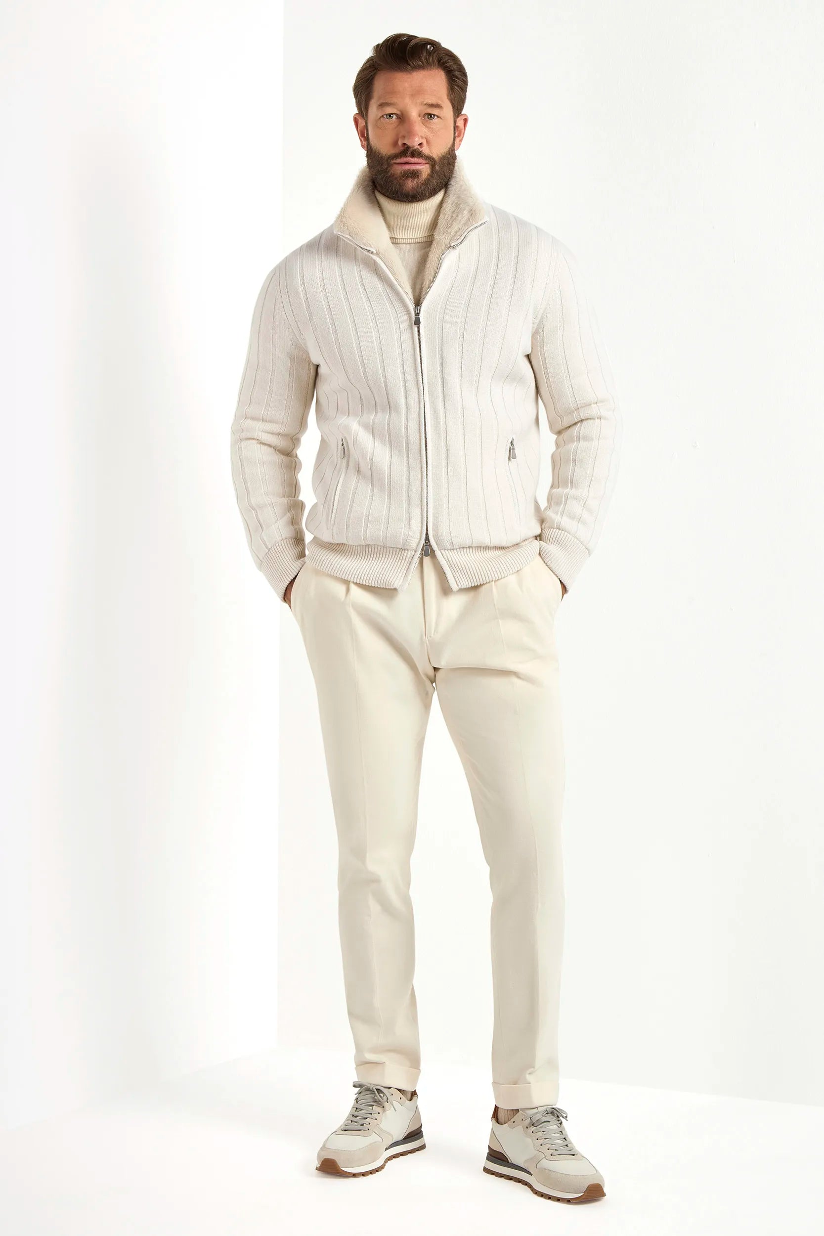 Off-white ribbed cashmere bomber with fur - Made in Italy