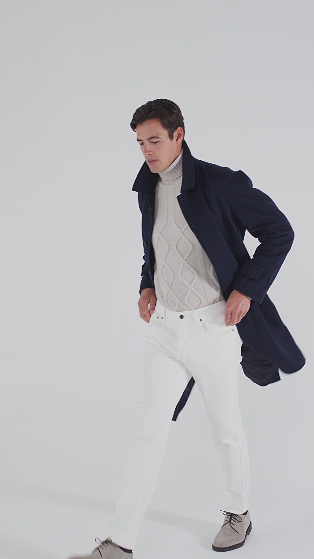 Our raglan coat features a five-button closure up to the neck, a waist belt and diagonal front welt pockets. A box-pleat at the back finishes the piece.