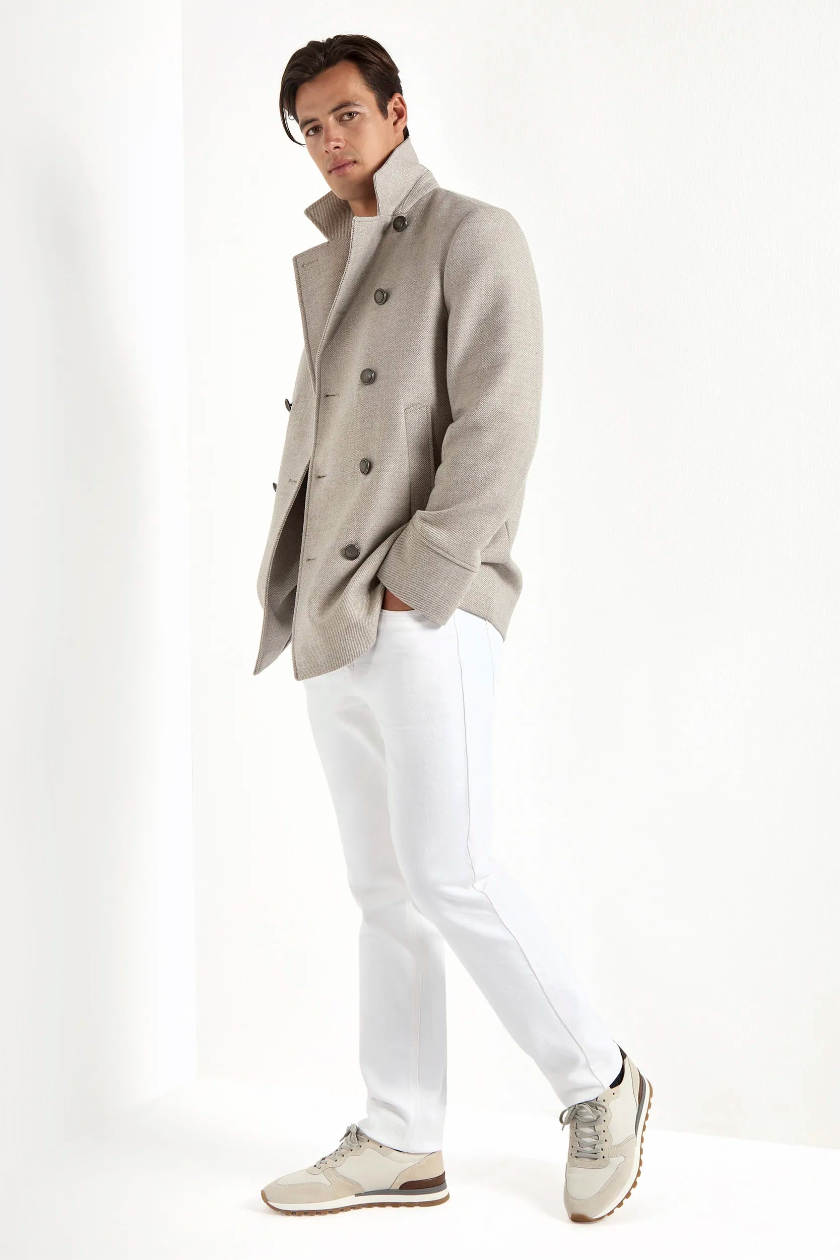 Discover our refined version of this classic and timeless garment. Our double breasted peacoat is crafted in Italy from 100% wool and features a metallic button closure.