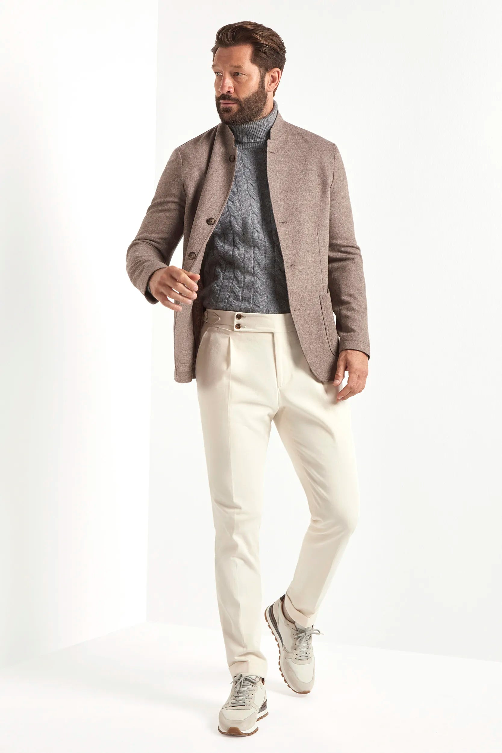 Crafted in Italy from soft wool flannel, the Taupe Coreana Jacket features a clean, Korean style collar and a semi-tailored fit. Designed with patch pockets and unlined for comfort and ease, it offers a modern alternative to the classic blazer. Finished with tonal stitching and refined detailing.