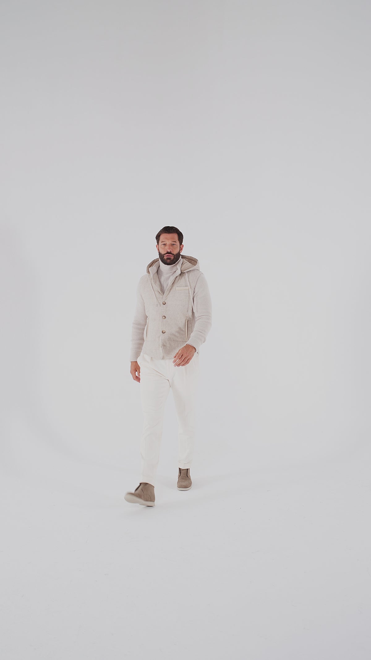 Introducing the Hooded Jacket in sand, a hybrid outerwear piece combining tailored silhouette with casual features. Crafted in Italy, it features a flannel wool body with tonal knitted sleeves and a detachable drawstring hood. A button closure, a chest pocket and side pockets finish the piece.