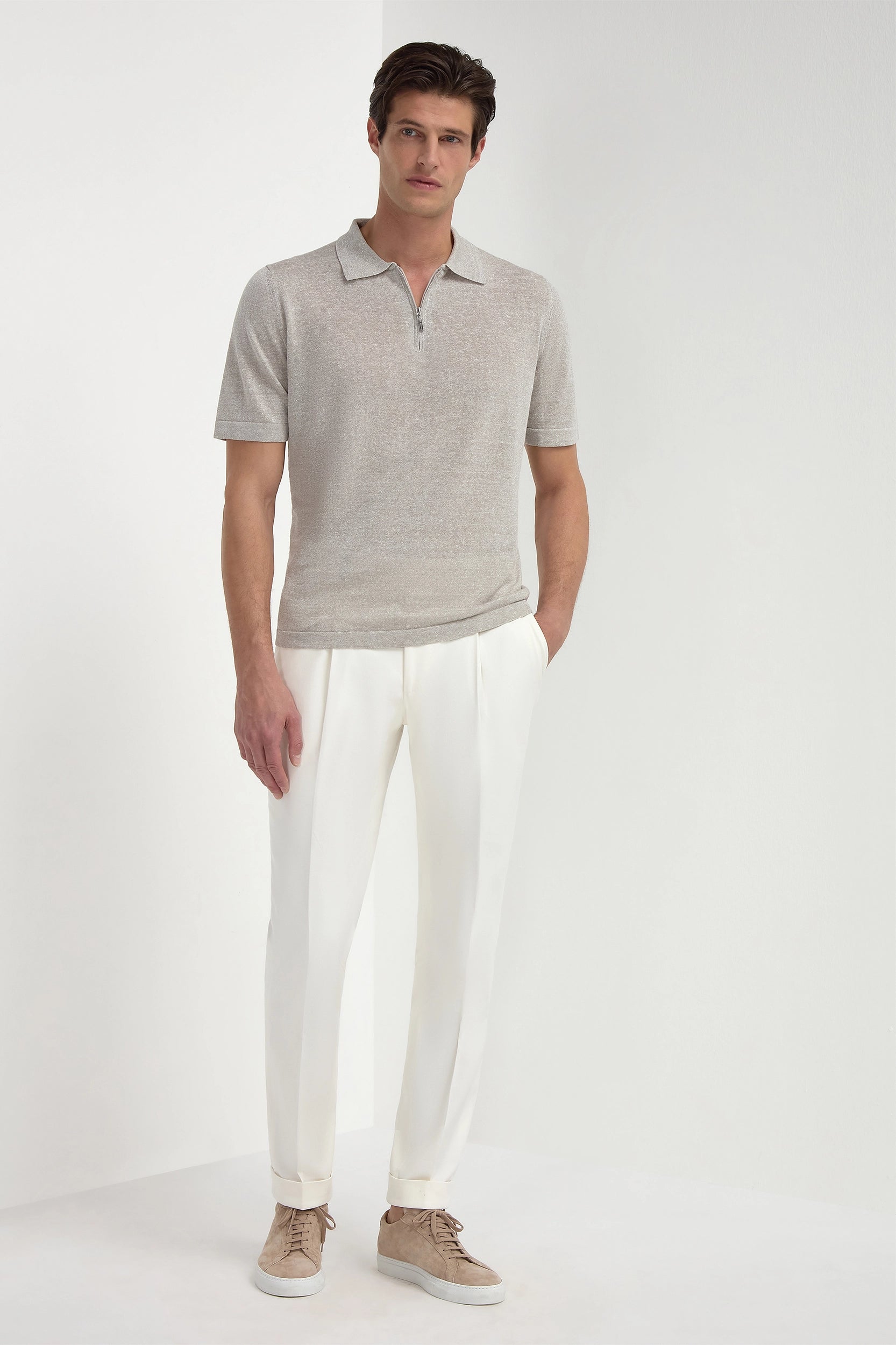 Sand linen and cotton zipped polo - Made in Italy