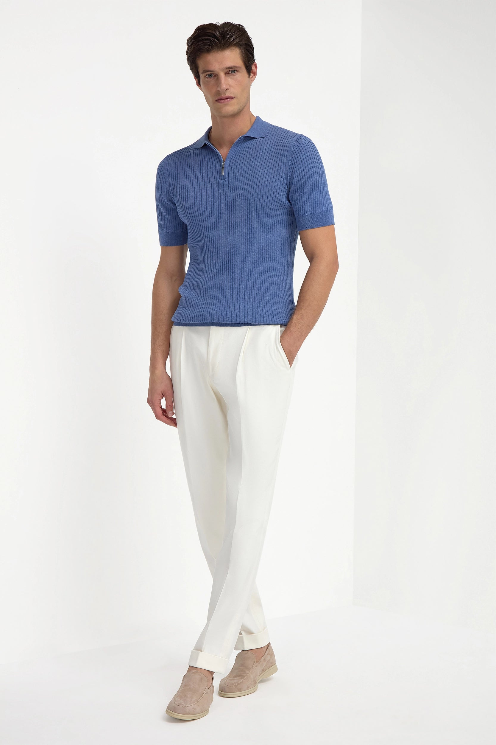 Sky blue thin rib zipped polo - Made in Italy