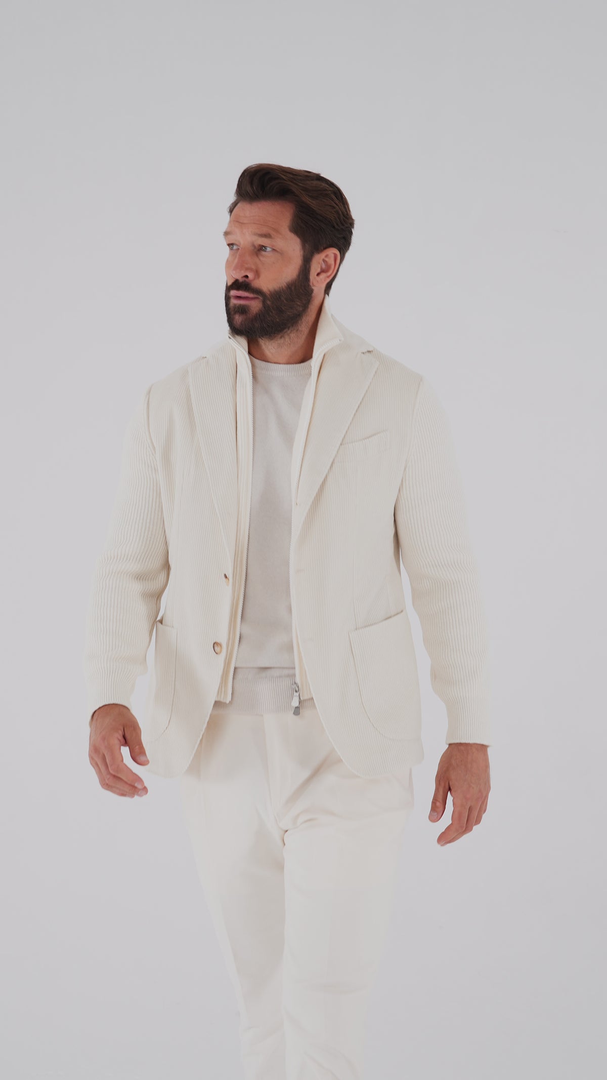 A white corduroy jacket with knitted wool sleeves combines texture and contrast in a sophisticated design. The structured body offers classic elegance, while the soft wool sleeves add a relaxed, contemporary touch—perfect for refined yet casual layering.