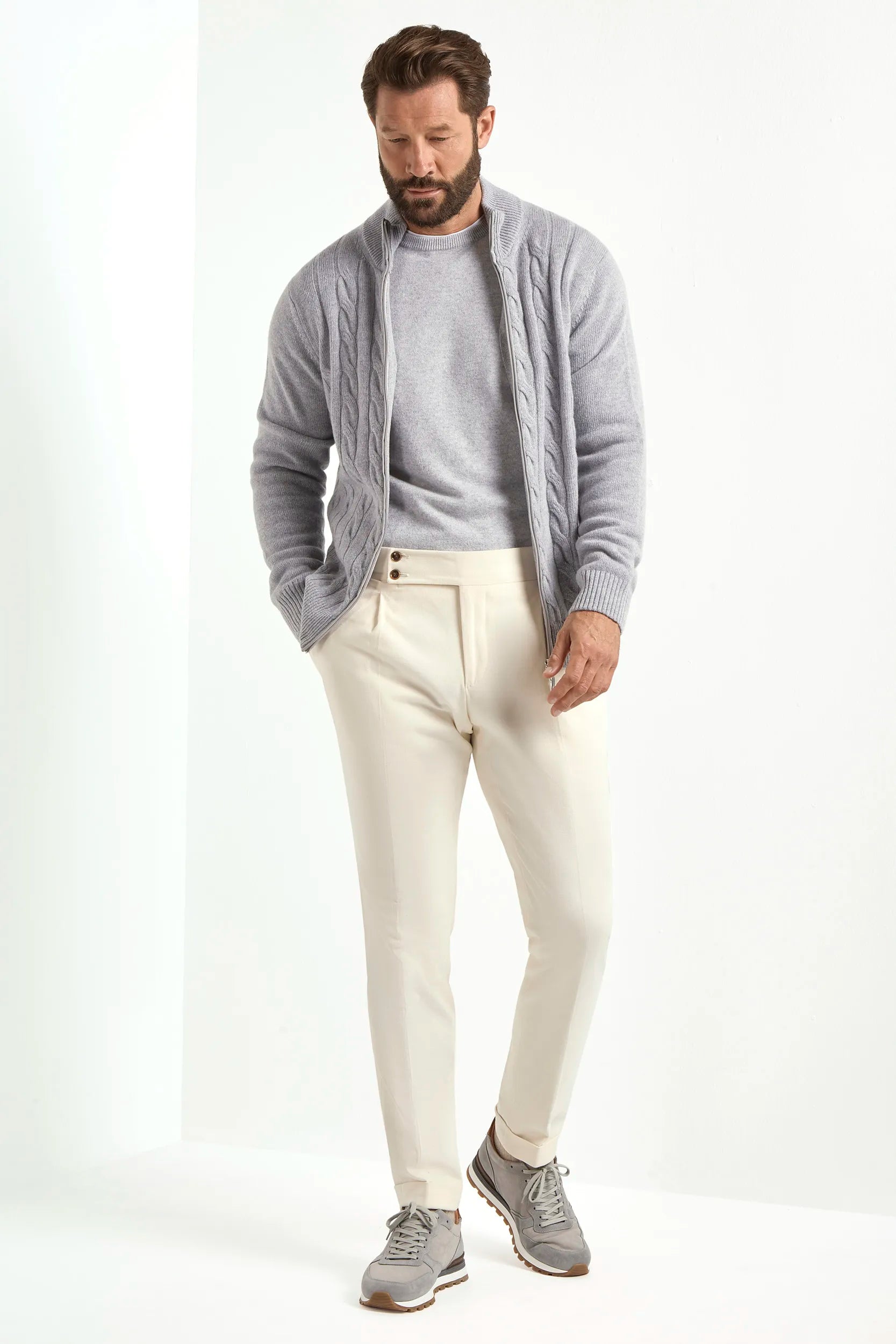 Maglione grigio chiaro a treccia in misto cashmere con Full Zip – Made in Italy