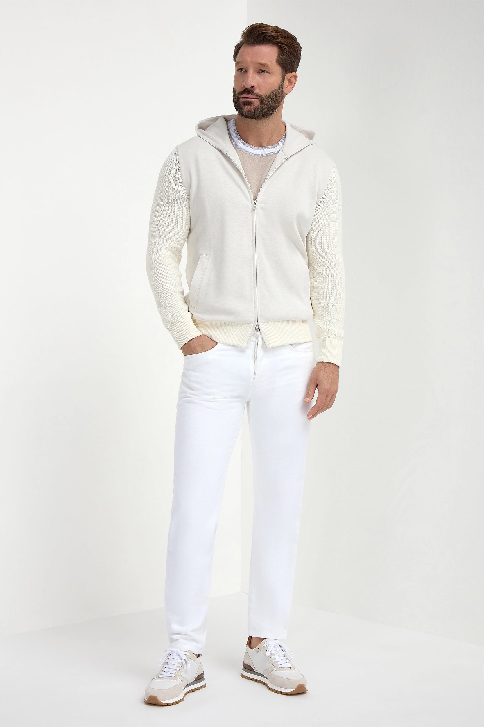 Presentiamo il bomber con cappuccio in avorio. È realizzato da Gran Sasso in una miscela super morbida di 98% cotone e 2% poliammide per un comfort assoluto e presenta una doppia chiusura con zip, cappuccio integrato e tasche laterali.