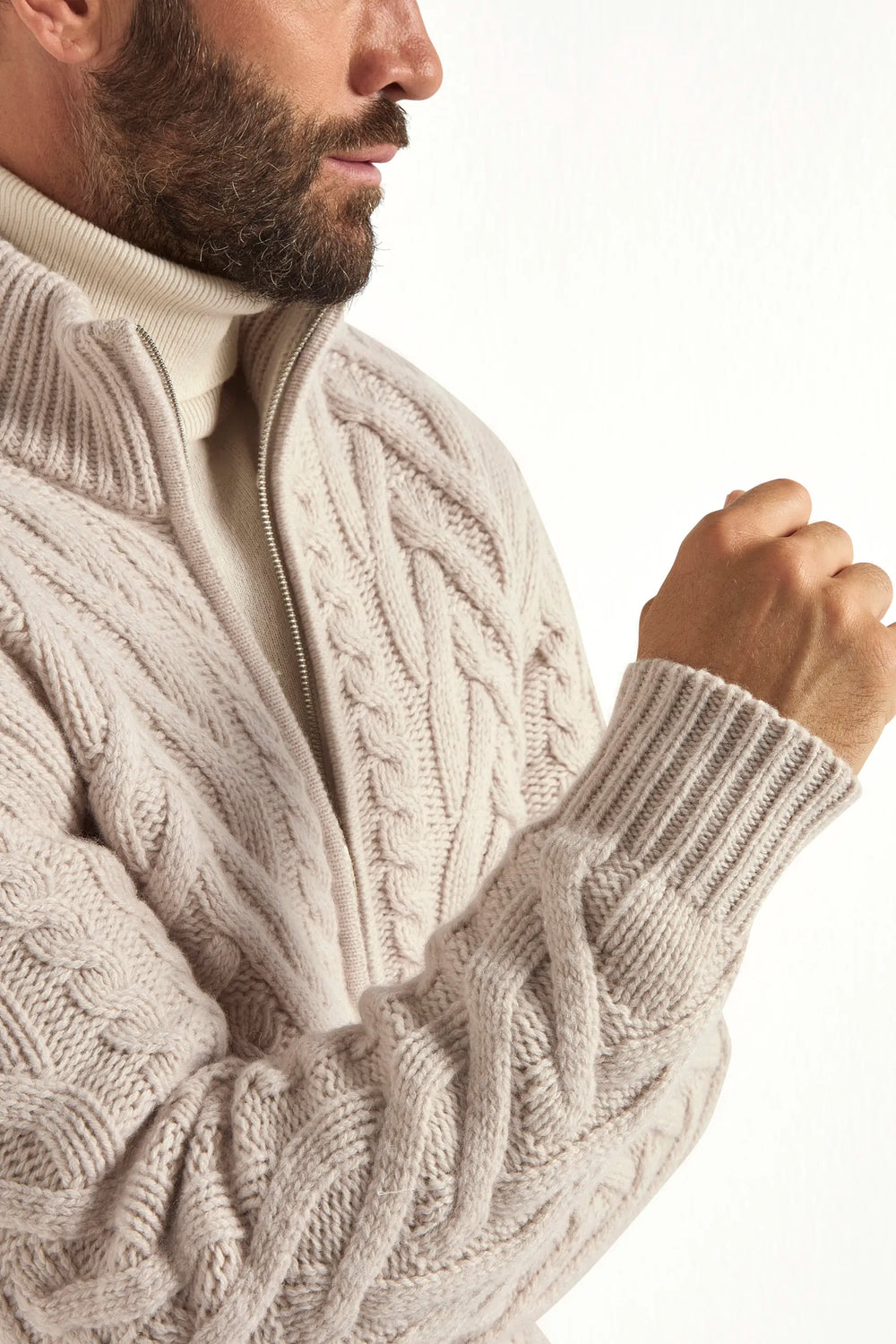Il cardigan con zip integrale in jacquard color sabbia è lavorato a maglia con un morbido misto lana e cashmere, che unisce calore a un comfort raffinato. Il suo motivo jacquard testurizzato e la pratica chiusura con zip lo rendono un capo versatile per stratificazioni senza sforzo nei mesi più freddi.