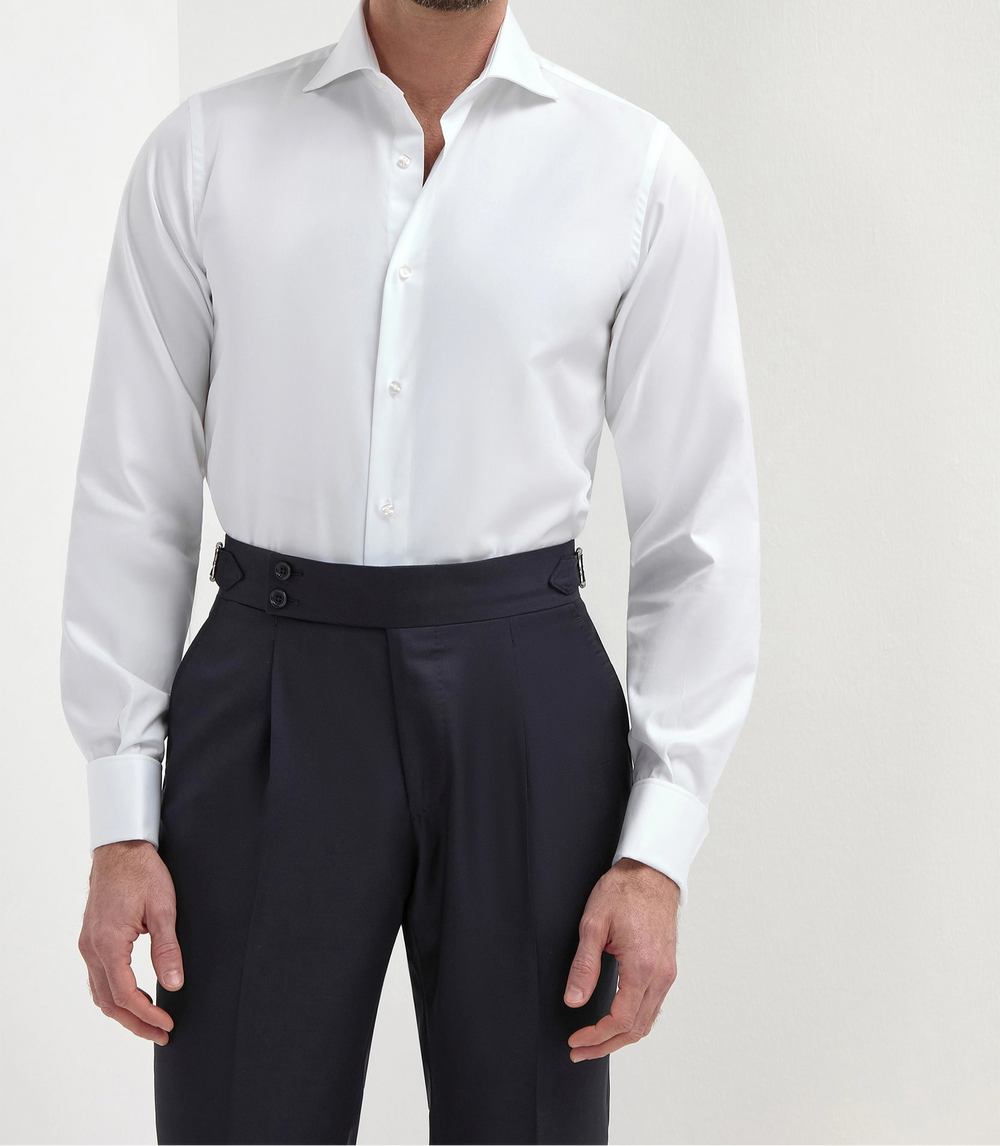 Camicia classica a doppio polsino azzurro chiaro, realizzata a Napoli con grande attenzione ai dettagli.