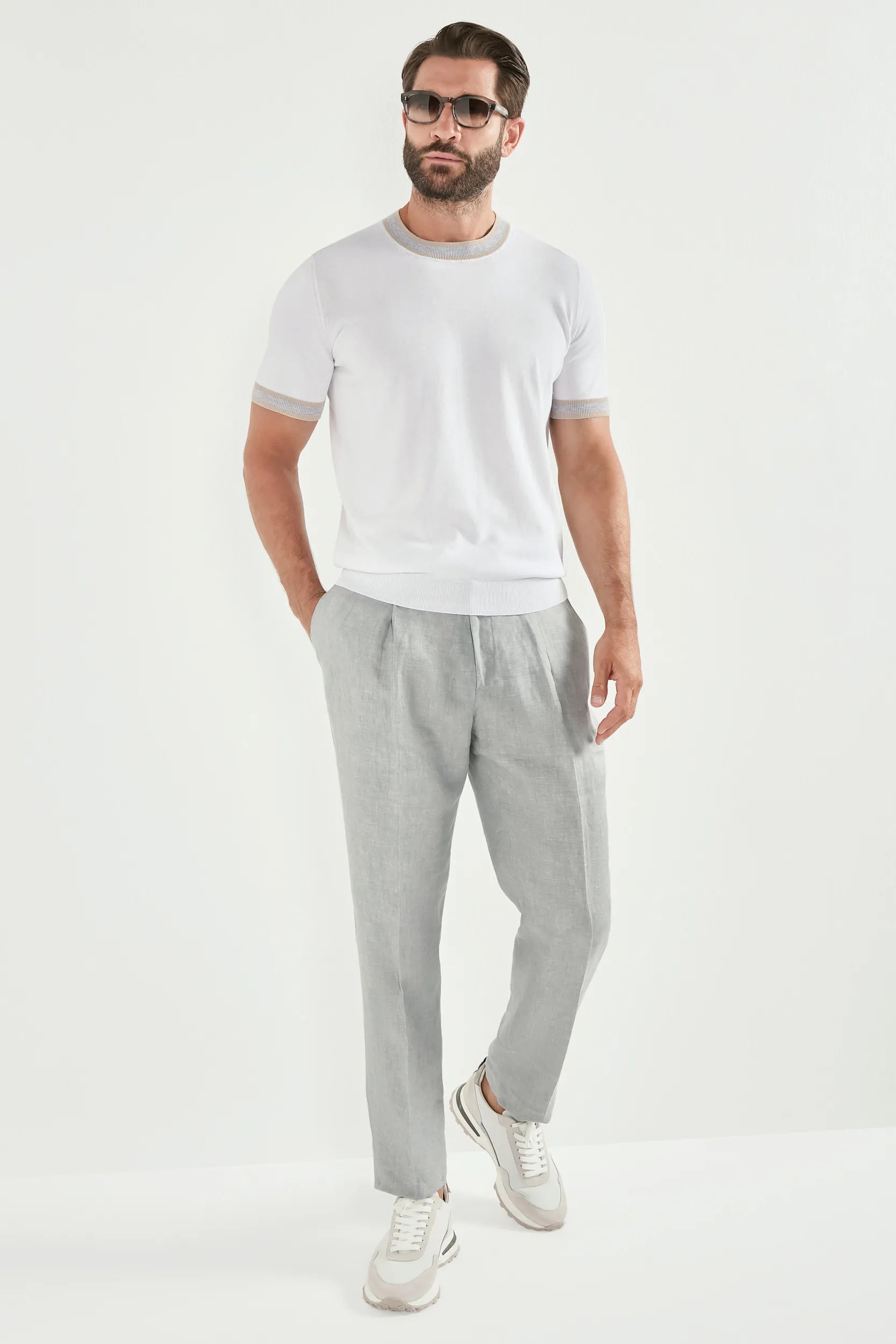 Presentiamo la t-shirt bicolore, realizzata in Italia in morbido cotone 100%. Presenta righe grigie e bianche a contrasto su collo e polsini per un look elevato e casual.