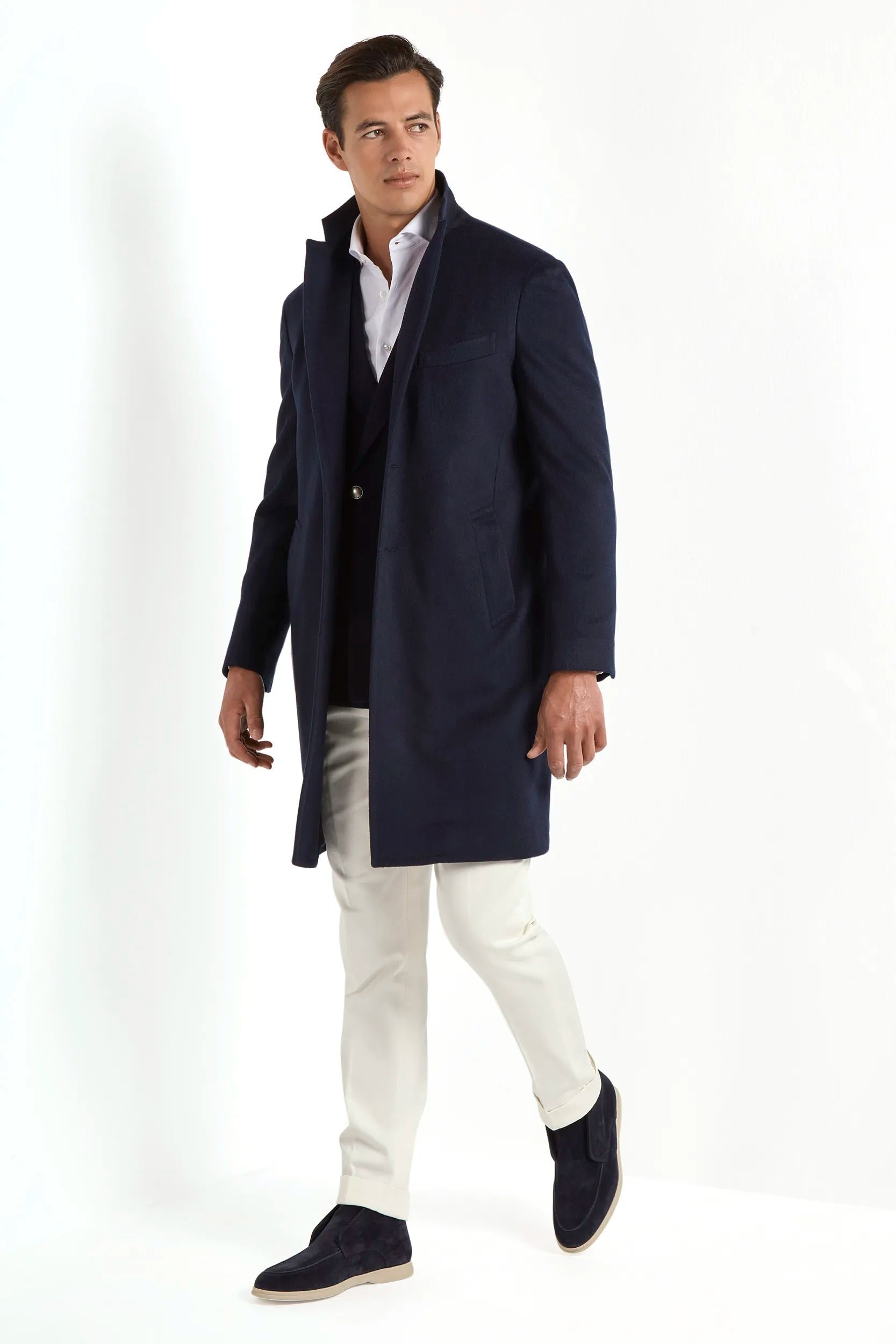 Our classic blue overcoat is crafted from luxurious and soft Loro Piana wool and is an essential formal outerwear piece that will show great versatility when worn over any suit.